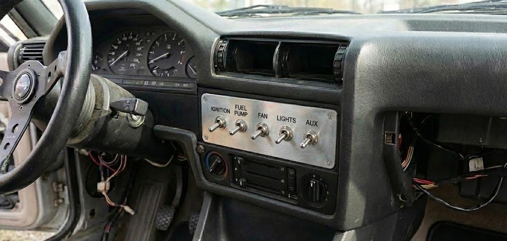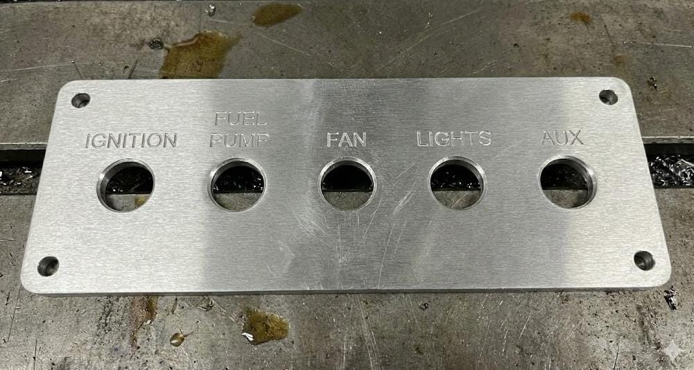Option 3: Switch Panel + Custom Engraving Pre-machined with 5 holes for standard toggle switches (12mm hole size). Includes CUSTOM ENGRAVING of your choice above each switch (e.g., FUEL, FAN, PUMP).