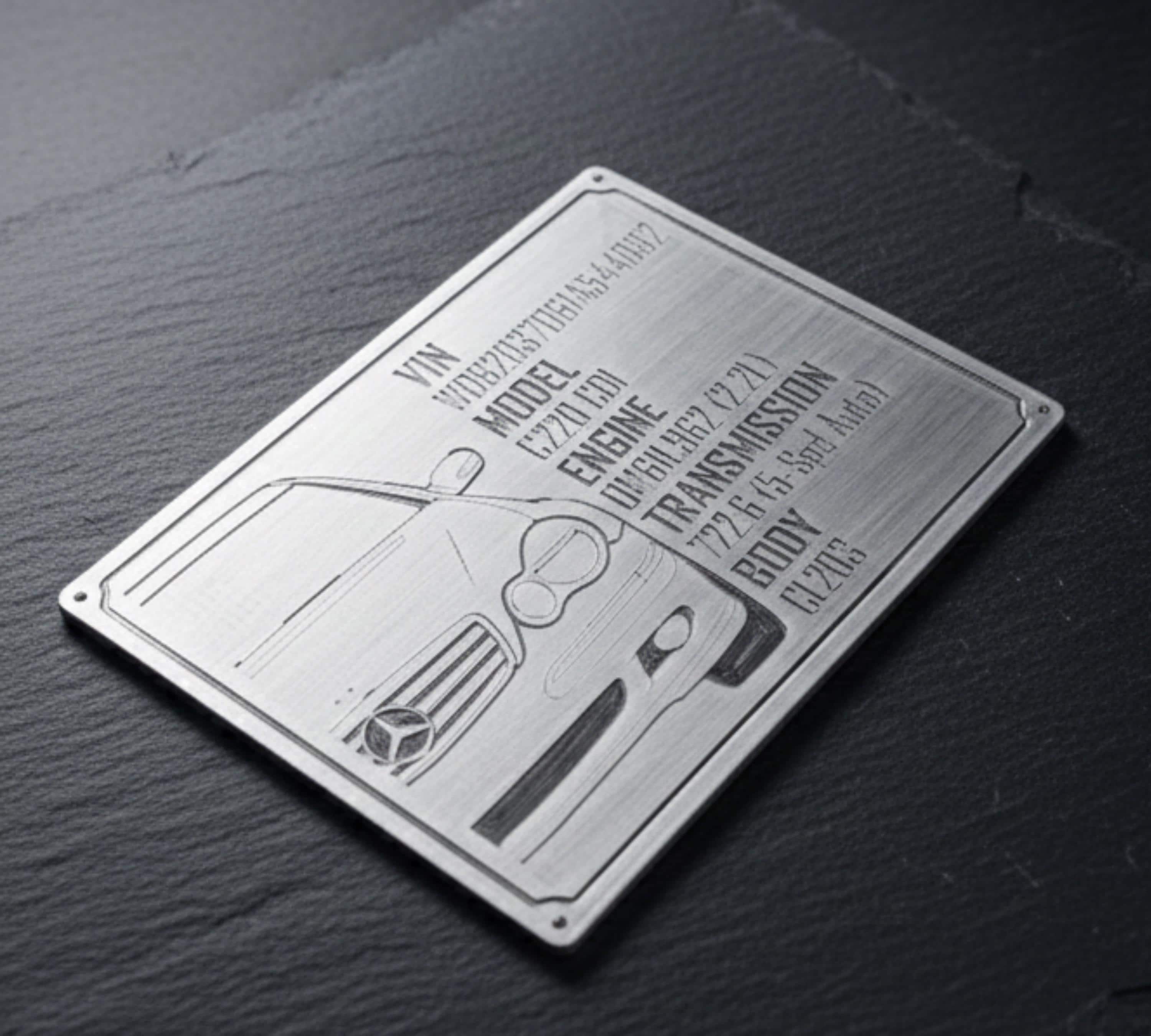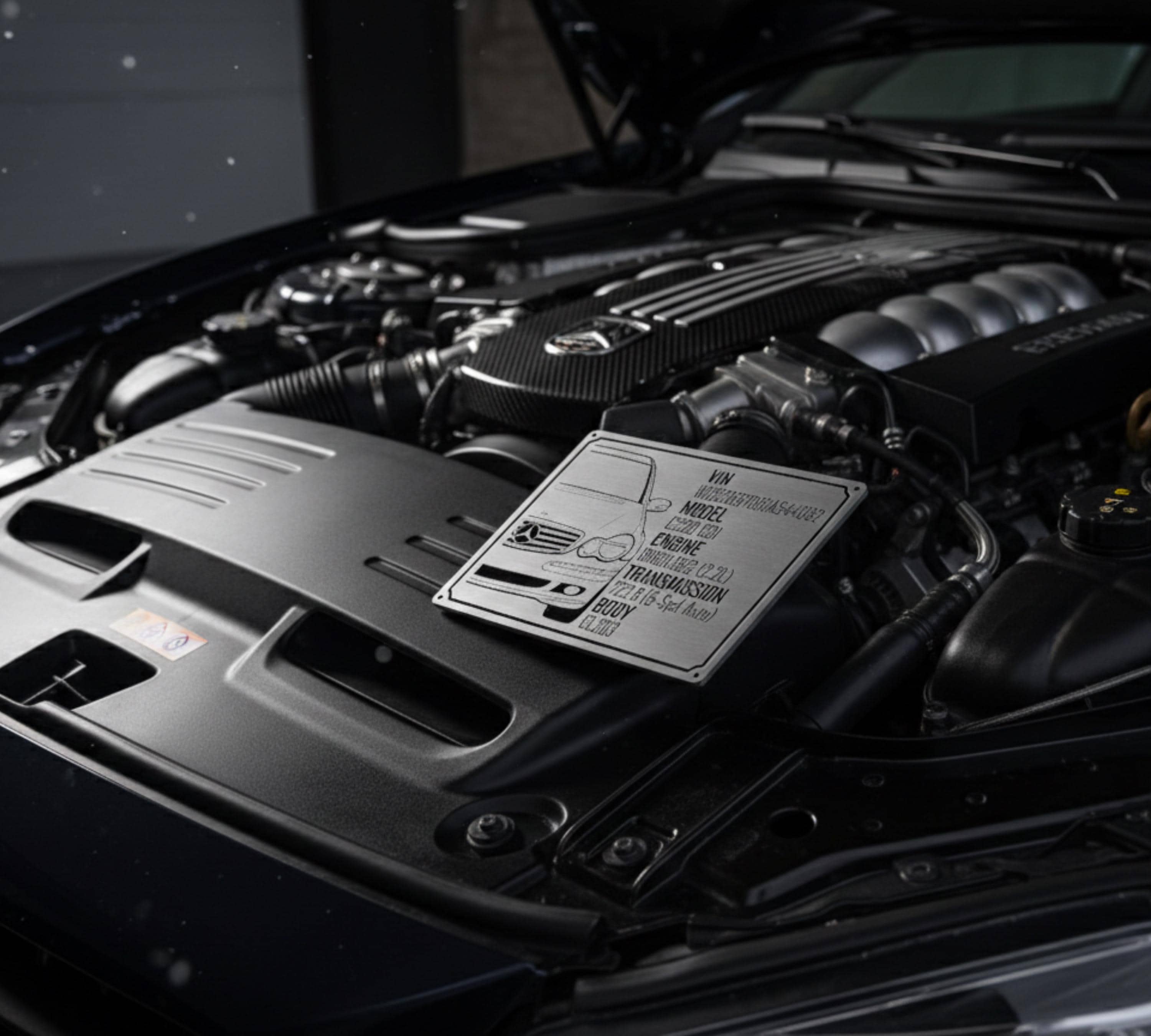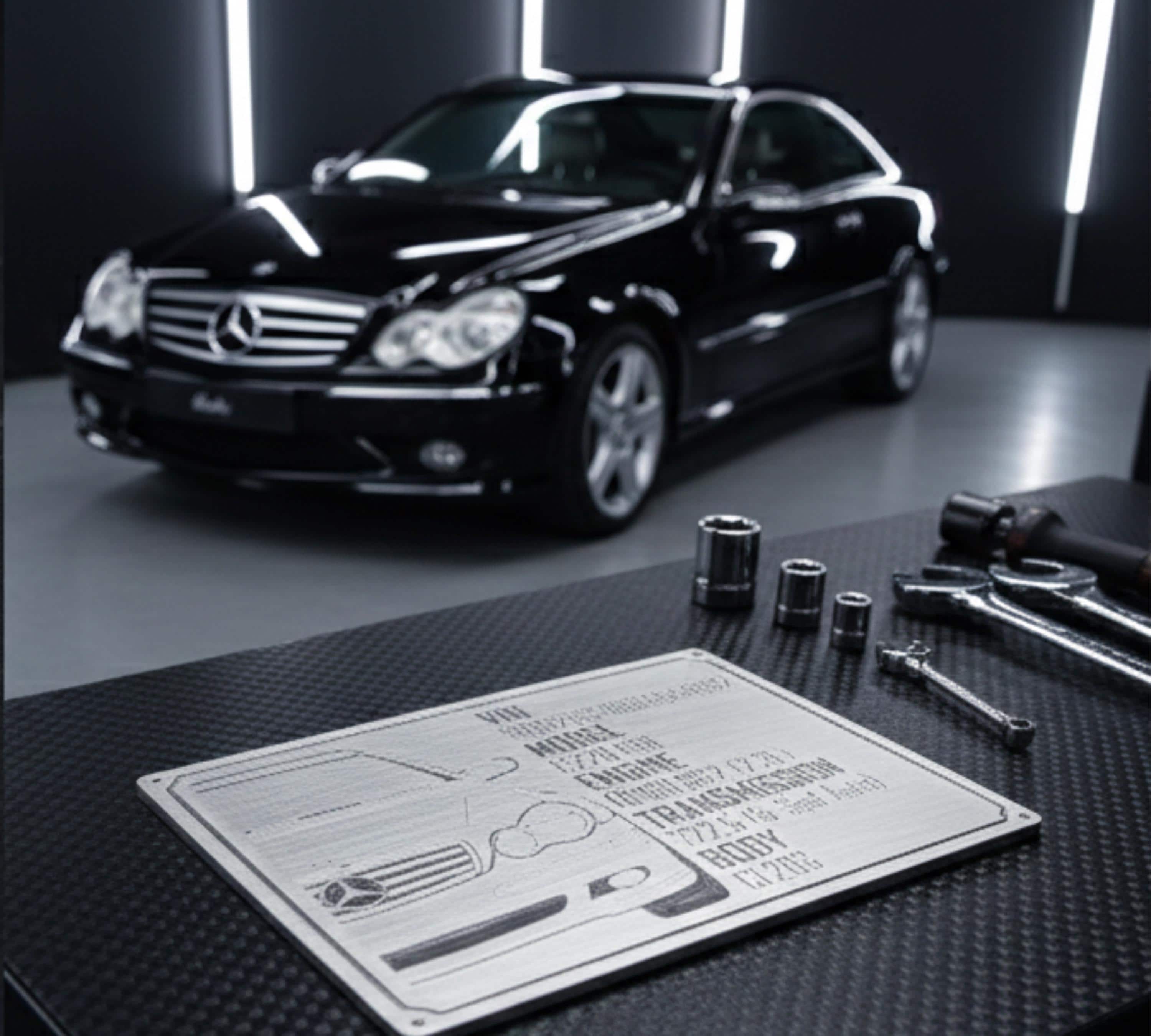 Custom Engraved Billet Aluminum Car Spec Plate for engine bays. Precision CNC machined 200x150mm data plaque for show cars. The ultimate personalized gift for BMW, MERCEDES, Audi, and car enthusiasts.